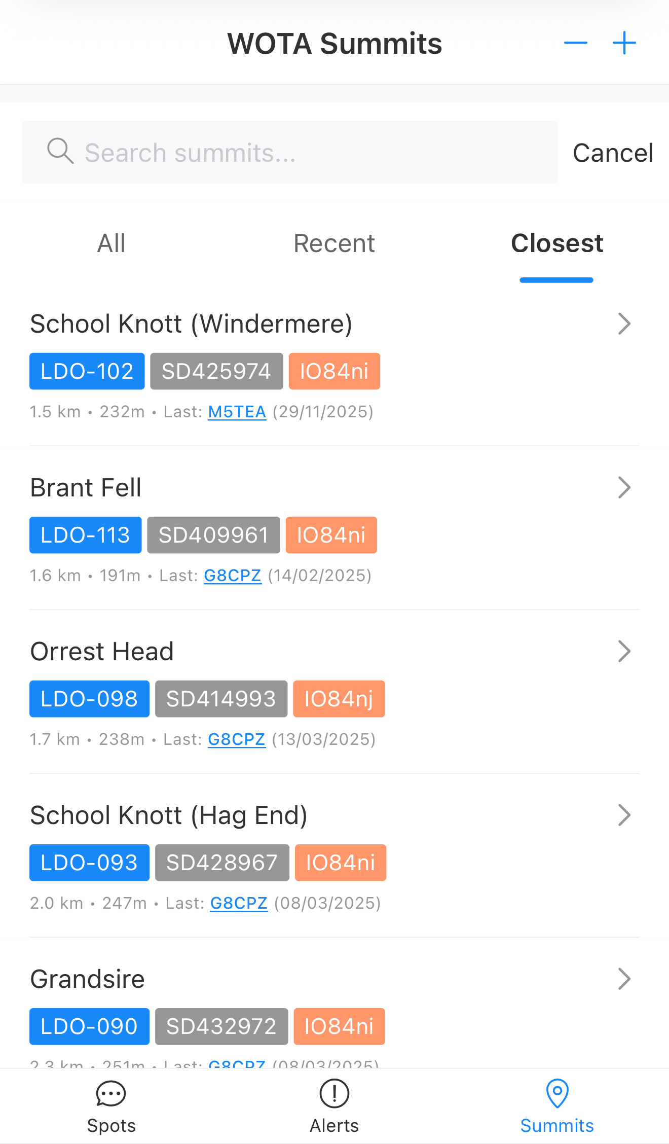 The summits page/tab has a list of summits with more information such as height, SOTA reference, grid reference, last activated by etc. You can sort by Wainwright reference, most recently activated or nearest location. The National Grid reference can be clicked to take you through to open mapping.