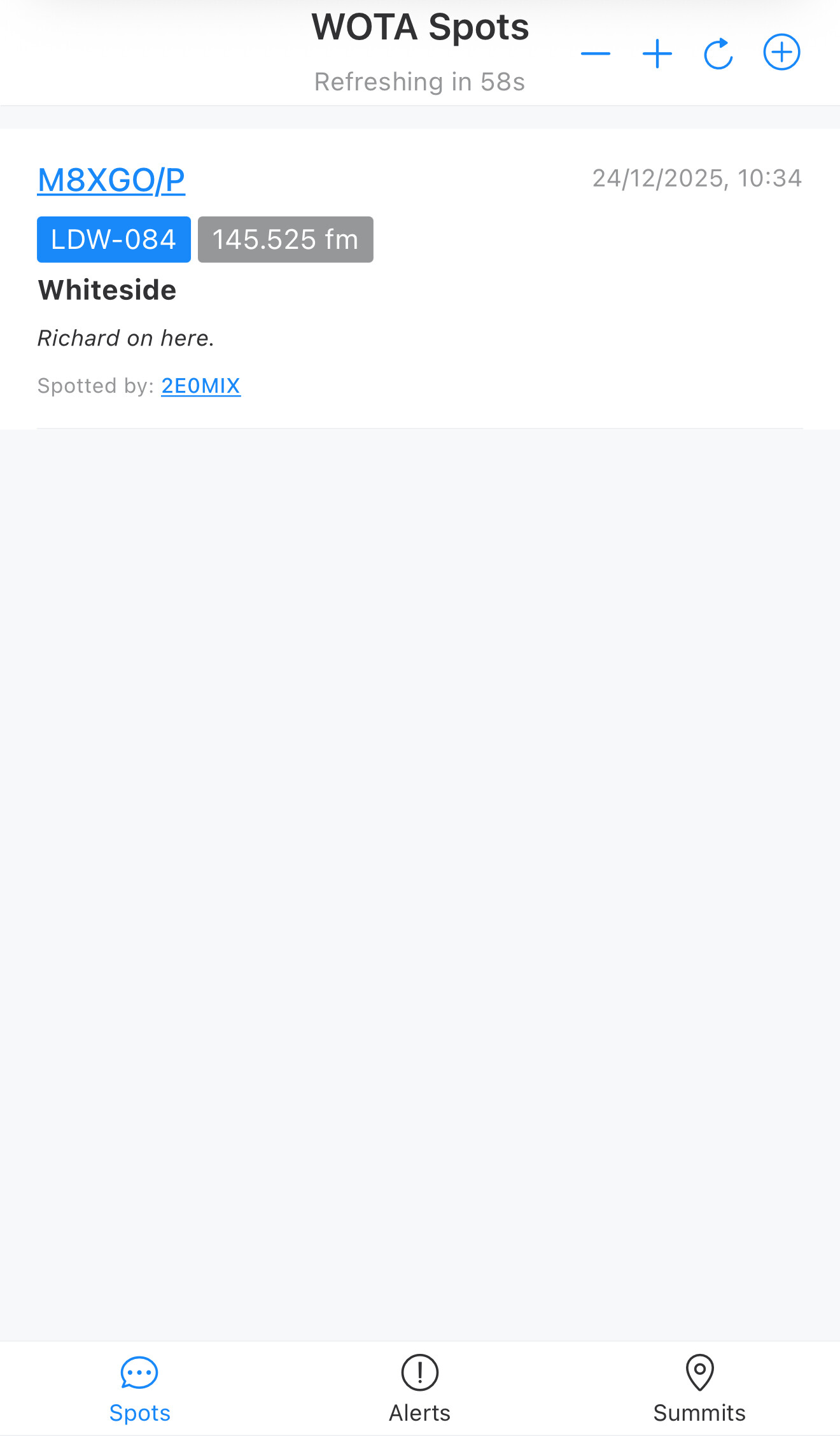 Features of the spots list: in the title bar you have zoom buttons, a refresh now button and an add spot button. The page automatically refreshes every minute.