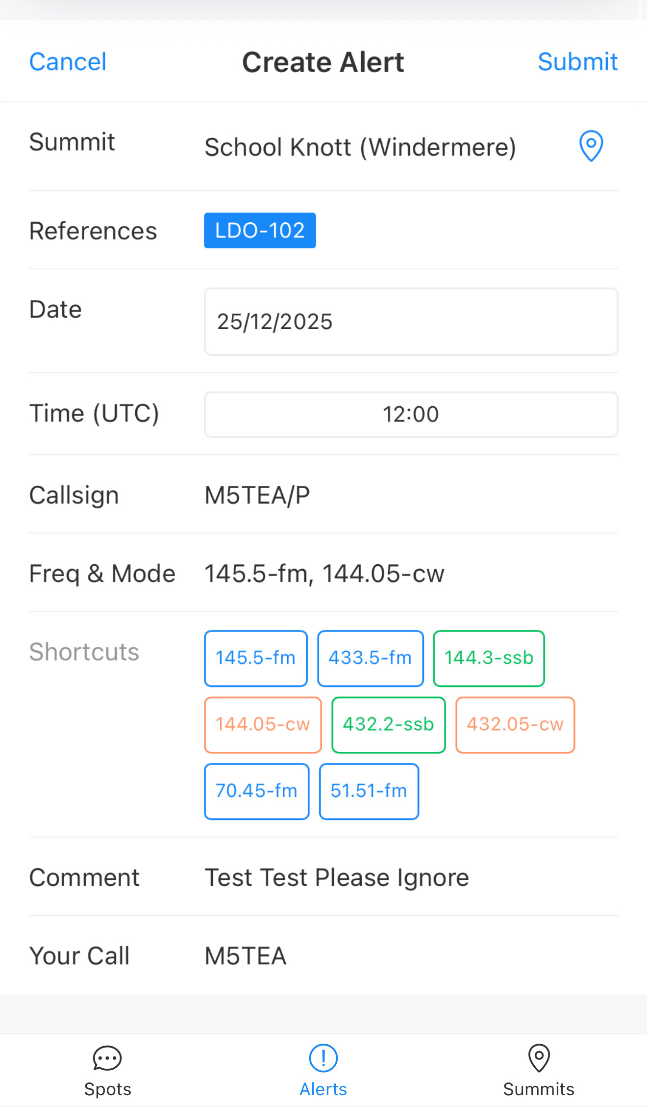 The create spot form is pre-populated with the frequency 145.500 and mode FM if blank. The GPS icon automatically selects the nearest summit. The Callsign and Your Call fields default to uppercase.