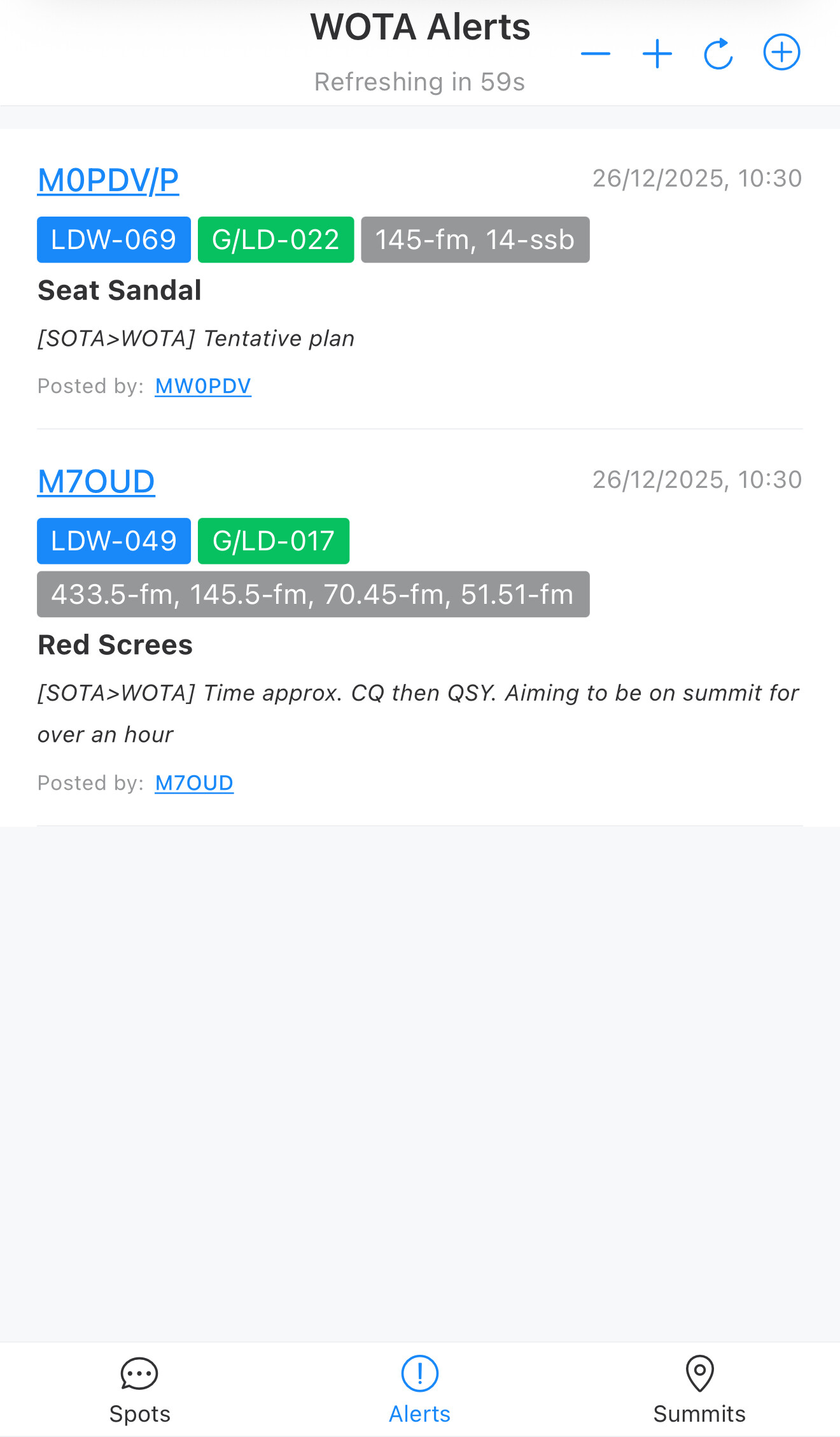 Each spot contains the callsign of the activator, the summit reference, the frequency, time of spot, the spotter callsign and comment. The spot is highlighted in green if it was submitted in the last hour. Clicking on the callsign links through to QRZ, the summit reference to the main WOTA website.